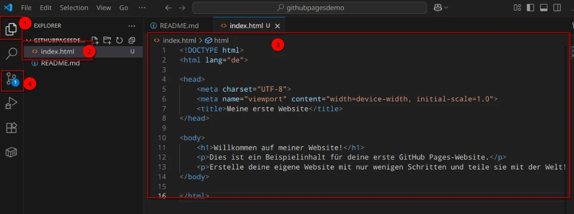 Bis jetzt haben wir in unserem Repository nur eine README-Datei, die als Platzhalter dient. Nun fehlt noch der Inhalt deiner künftigen Website, den wir mit einer index.html-Datei erstellen werden.