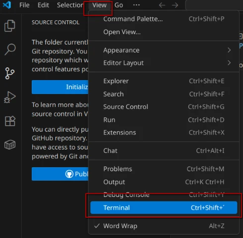 Dazu brauchst du eine Kommandozeile, wie die Eingabeaufforderung (Windows), das Terminal (Mac) oder eine Shell (Linux). Glücklicherweise ist die Kommandozeile, auch Terminal genannt, in VSCode integriert.