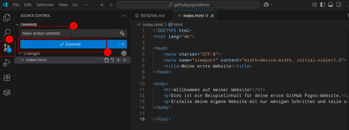 Und um dann zu veröffentlichen, wechseln wir mit einen Klick in die linke Symbolleiste für Git (3. Symbol). Dann geben wir eine sogenannte Commit-Nachricht ein, die unsere Änderungen dokumentiert. Also z.B. "Mein erster Commit.". Dann klicken wir auf die "Commit" Schaltfläche.