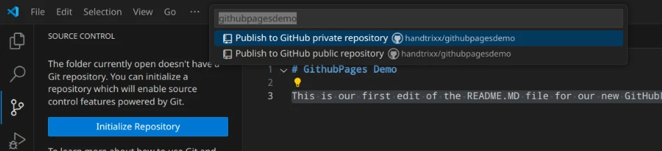 Wenn das erfolgt ist, solltest du in VSCode im oberen Bildschirmbereich eine Abfrage nach dem gewünschten Namen deines Repositories sehen. Du kannst den vorgeschlagenen Namen übernehmen oder einen eigenen Namen für dein Repository eingeben. Außerdem musst du hier die Sichtbarkeit des Repositories auf öffentlich (Publish to GitHub public repository) einstellen, damit deine Website für alle zugänglich ist. Bestätige anschließend deine Auswahl, um fortzufahren.