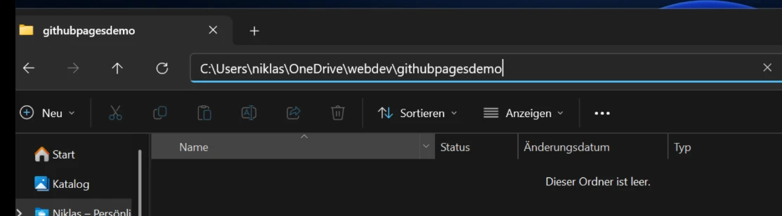 In unserem Beispiel erstellst du also einen Ordner "webdev" in deinen eigenen Dateien und darin den Unterordner "githubpagesdemo". So ähnlich sollte das dann aussehen: