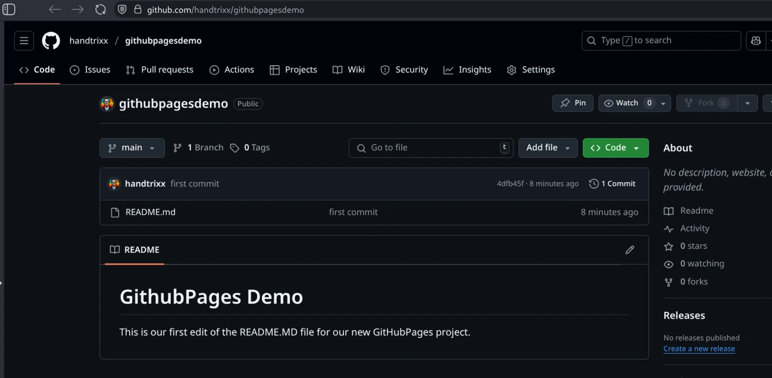 Wir gehen davon aus, dass wir Anfänger sind und mit einem Computer mit einem Intel (oder AMD) Prozessor arbeiten, auf dem Windows, macOS oder Linux installiert ist. Unser Ziel ist es, eine von uns erstellte Website unter einer von GitHub generierten URL wie https://handtrixx.github.io/githubpagesdemo/ öffentlich bereitzustellen. Das Ergebnis soll dann so aussehen: