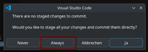 Im folgenden einmalig auftauchenden Dialogfenster wählst du "always" bzw. "immer", um zukünftige Bestätigungen zu automatisieren und den Workflow zu vereinfachen. Dadurch sparst du Zeit und kannst dich auf das Wesentliche konzentrieren.